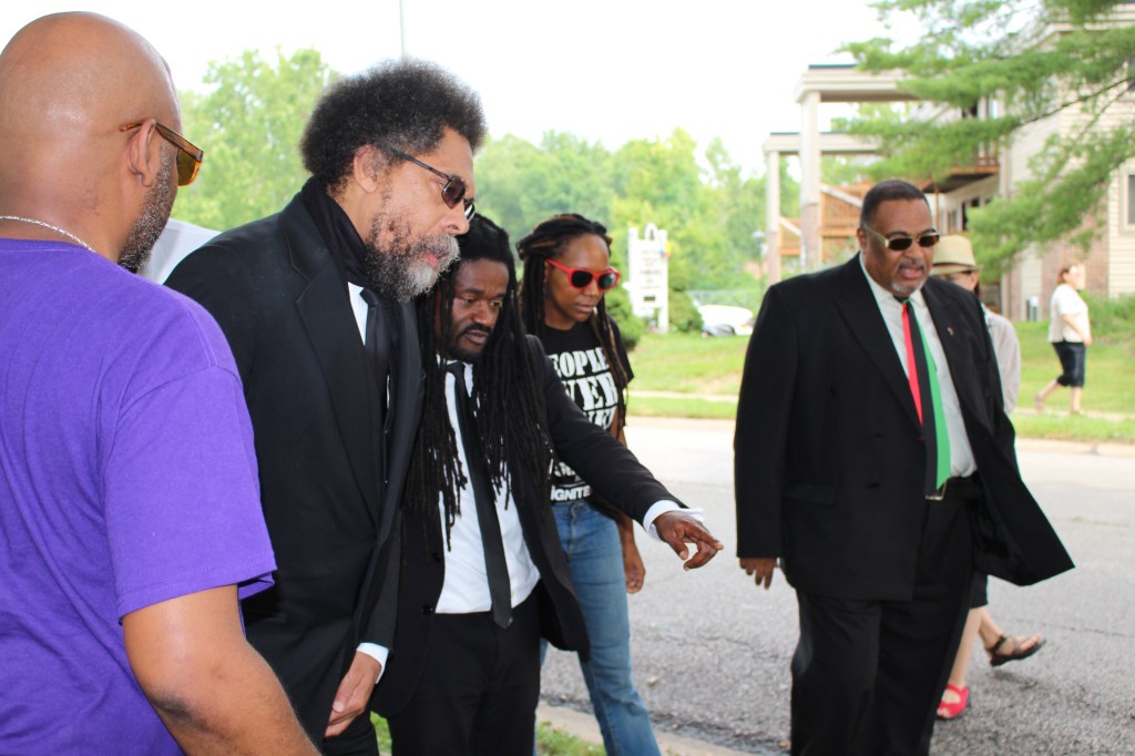 Cornel West looking at the plague dedicated to Mike Brown